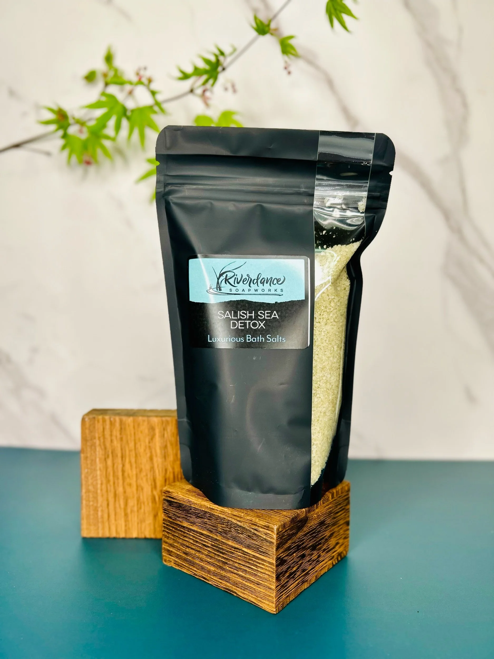 Dive into a purifying and rejuvenating experience with Salish Sea Detox Bath Salts. Designed to cleanse and refresh, this blend harnesses the power of natural ingredients to detoxify and revitalize your skin. Infused with sea salt, Epsom salt, and French clay, these bath salts draw out impurities, while powdered kelp and chlorella provide nutrient-rich benefits. Hand-crafted with love in Olympia, Washington, Salish Sea Detox Bath Salts are toxin-free and cruelty-free, offering a pure and mindful indulgence. Add 1/2 cup to your bath and let the detoxification process rejuvenate you. Ingredients include Sea Salt, Epsom Salt, French Clay, Powdered Kelp, Olive Oil, Essential Oils, Water, Dendritic Salt, and Chlorella. Relax, purify, and rejuvenate with the essence of the sea.